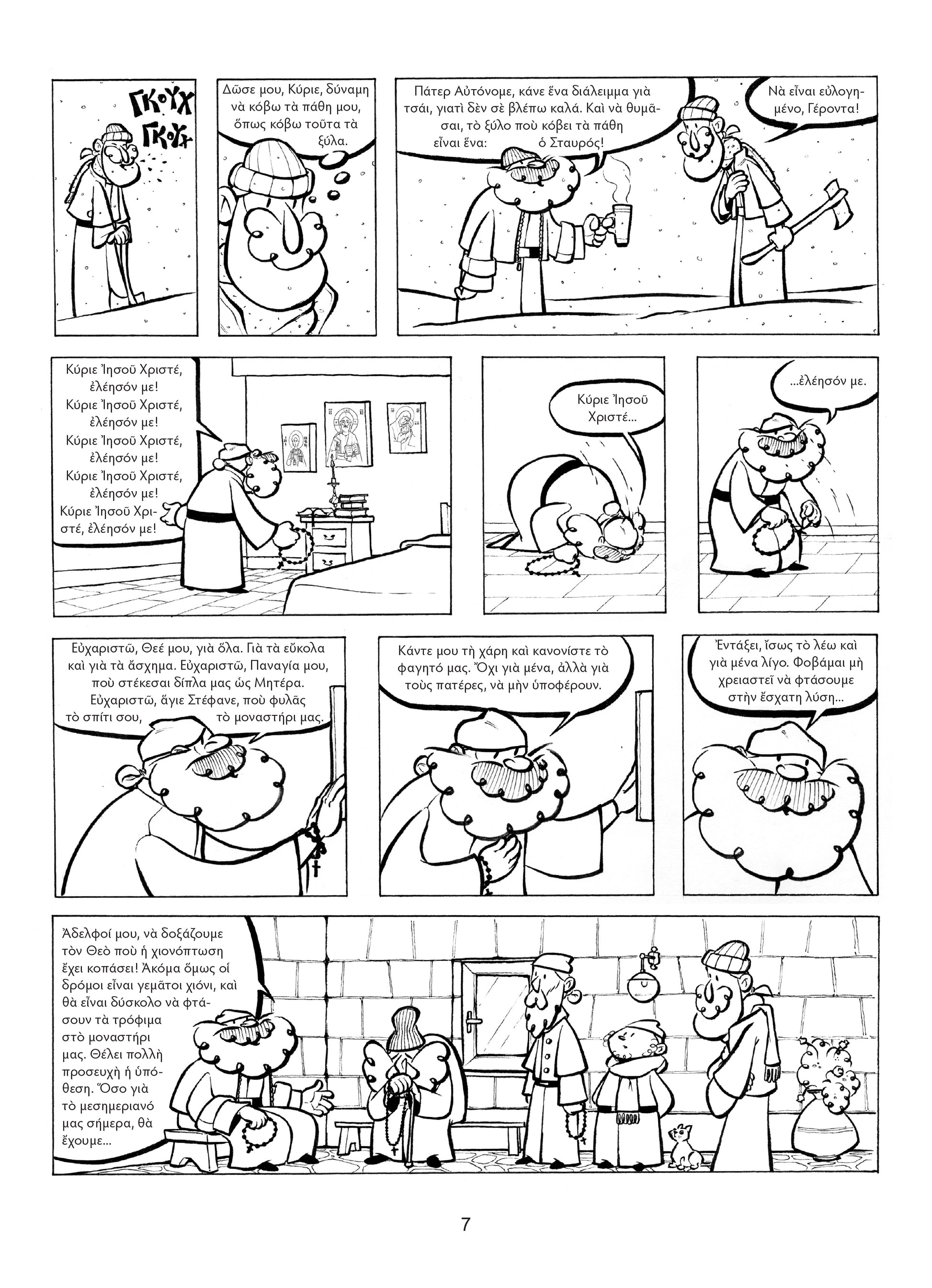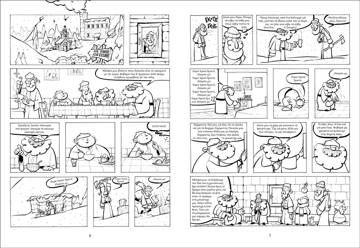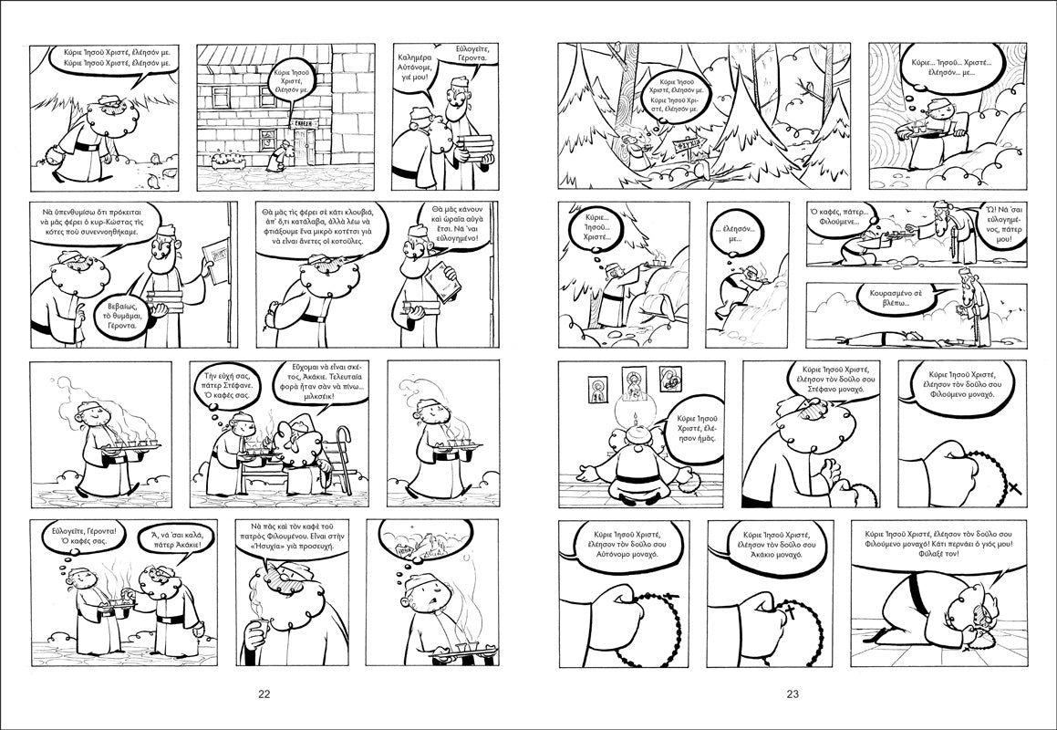 Το πρώτο τεύχος της νέας μας σειράς, με τίτλο "Ευλόγησον". Μικρές ιστορίες, εμπνευσμένες από την μοναστική ζωή, που συνδυάζουν την πνευματικότητα με το αγνό χιούμορ. Μια πρωτότυπη ιδέα, αφού σε αντίθεση με τα συνηθισμένα κόμικ, αυτό έχει ως θέμα του τη μοναστική ζωή, αλλά και την κοινωνία των μοναχών με τους λαϊκούς. Τα μικρά αστεία περιστατικά θυμίζουν ιστορίες από το Γεροντικό, μεταφερμένα με έμπνευση στο σήμερα. Κι έτσι μέσα από τα γεγονότα αναδεικνύεται η ομορφιά της εκκλησιαστικής κοινότητας, όπου κι αν βρισκόμαστε, μοναχοί… ή και με παρέα! Μια διαφορετική πρόταση για τα νέα παιδιά, τους εφήβους, αλλά και κάθε άνθρωπο που γνωρίζει ότι η ζωή κοντά στον Χριστό, είναι ζωή χαράς.